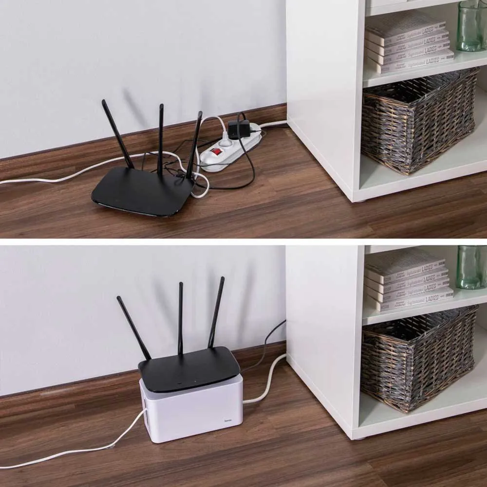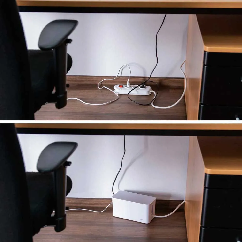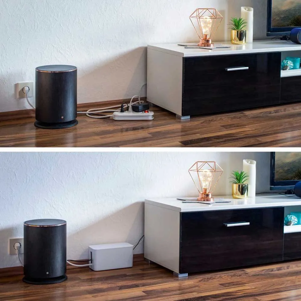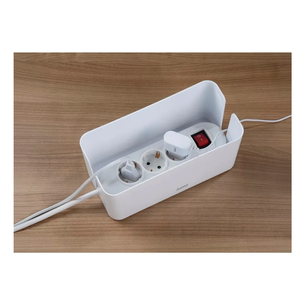 Den främsta fördelen med HAMA Mini är dess förmåga att omedelbart dölja och organisera kabeltrassel. Genom att rymma en hel grenkontakt och dess anslutna kontakter inom sin kompakta ram, förvandlar den en farlig härva till en enda, prydlig enhet. Detta förbättrar omedelbart estetiken i ditt utrymme, vilket skapar en mer fokuserad och produktiv arbetsyta eller ett mer avkopplande och inbjudande vardagsrum. Dess mångsidiga design gör den till en av de mest praktiska organisatörerna som finns, perfekt för placering antingen diskret på golvet bakom ett skrivbord eller TV-bänk, eller stolt på ditt skrivbord.
