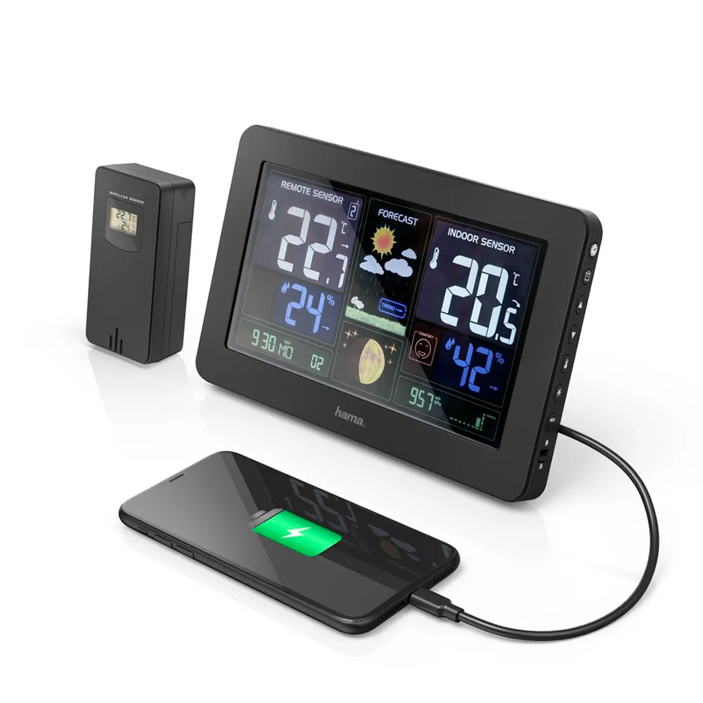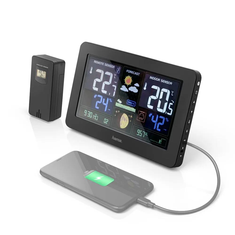 Hjärtat i HAMA Premium Väderstation är dess livfulla färgskärm som presenterar en mängd information i ett tydligt, intuitivt och estetiskt tilltalande format. Med en enda blick kan du ta del av aktuella förhållanden både inomhus och utomhus. Den medföljande trådlösa utomhussensorn överför tillförlitligt viktig data, vilket säkerställer att du vet den exakta temperaturen och luftfuktigheten i din trädgård, på din balkong eller i din trädgård – inte på en regional flygplats mil bort. Detta gör att du kan klä dig perfekt för dagen, bestämma när du ska vattna dina växter eller veta om du behöver skydda dem från en annalkande frost.