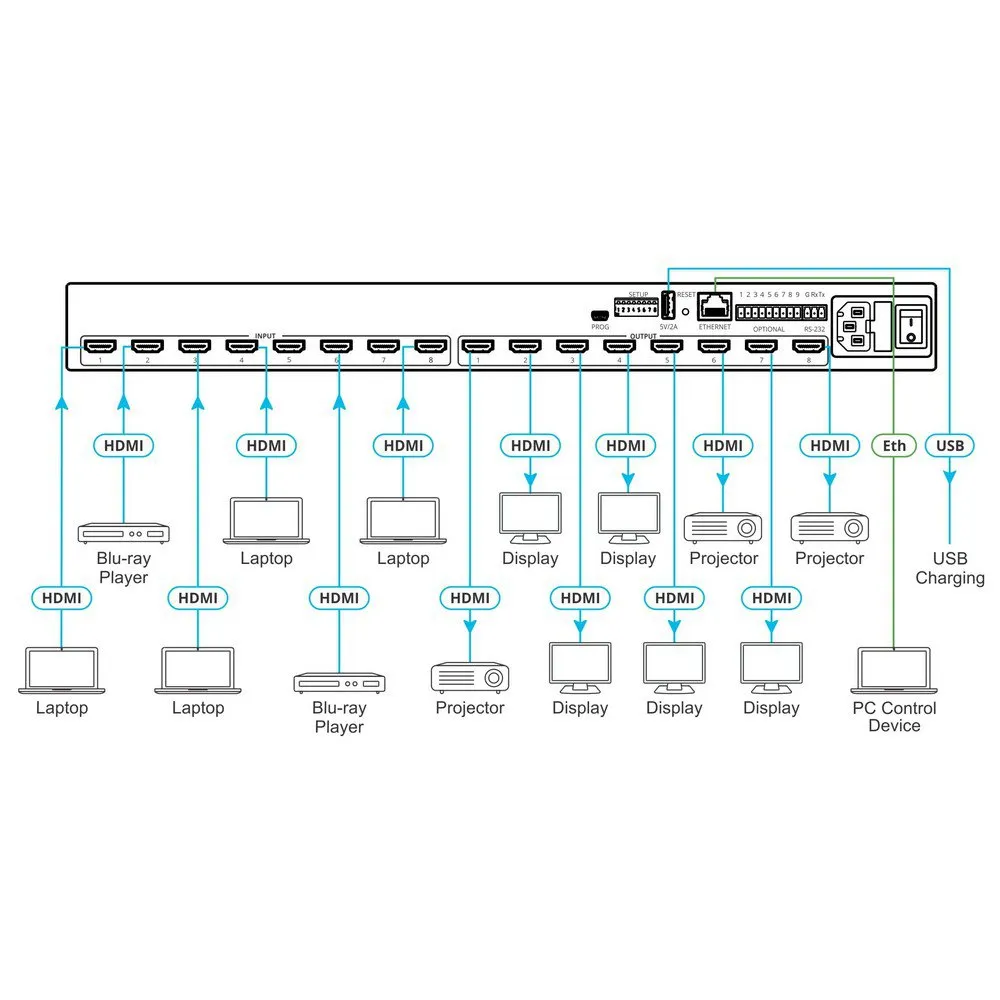 Den omdirigerar och utjämnar signaler och kan dirigera någon av 8 HDMI-, HDCP-kompatibla källor till någon eller alla utgångar samtidigt.