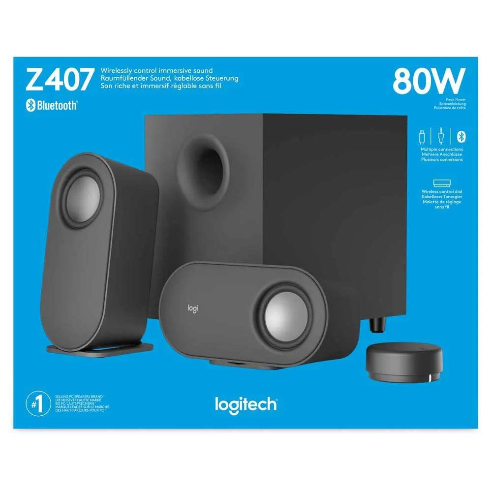 Upplev fantastiskt ljud med Logitech Z407. Dessa högtalare levererar 80W uppslukande, verklighetstroget ljud, drivet av DSP för en balanserad ljudbild från skarpa höga toner till kraftfull bas från den nedåtriktade subwoofern. Den intuitiva trådlösa kontrollratten låter dig hantera volym, bas och uppspelning från upp till 20 meters avstånd. Anslut upp till tre enheter via Bluetooth, mikro-USB eller 3.5 mm. Placera de eleganta, ovala högtalarna vertikalt eller horisontellt för att matcha din stil. En imponerande ljuduppgradering för alla skrivbord. EU-kontakt