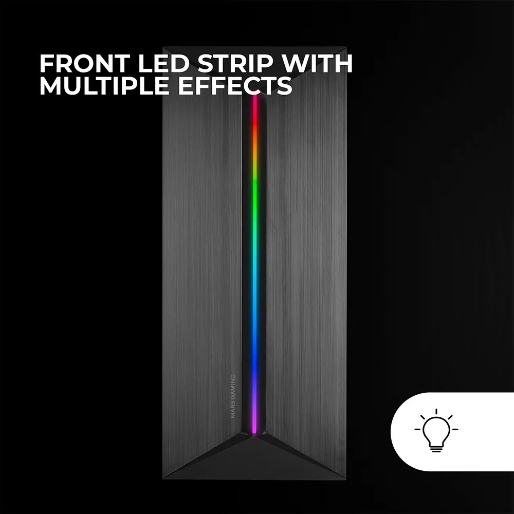 - MC-BLAZE kombinerar en minimalistisk, avantgardistisk design med LED-belysning som ger en personlig touch till alla installationer. Dess främre LED-remsa med förinställda effekter skapar en modern och elegant estetik, medan dess fönster över hela sidan belyser varje komponent och ger en tydlig och okomplicerad vy av insidan.