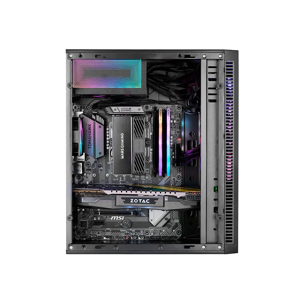 - MC-BLAZE är designad för att säkerställa effektivt luftflöde och har en förinstallerad FRGB bakre fläkt och en sidventil, vilket säkerställer exceptionell värmeavledning. Dessutom möjliggör dess design installation av CPU-kylare upp till 150 mm, vilket säkerställer exceptionell värmeavledning för din installation.