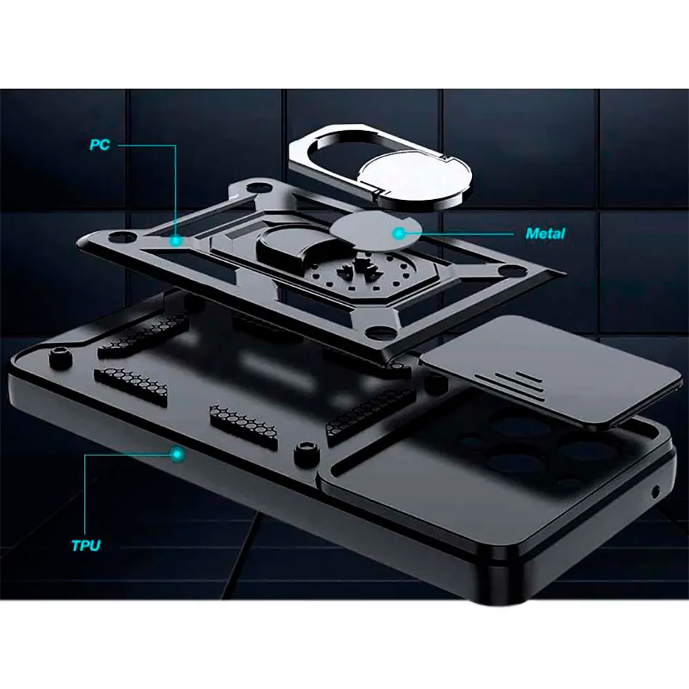 Funktioner Svart Militär Skal för Xiaomi Redmi Note 13 4G med kameraskydd, magnetiskt stativ och ring: