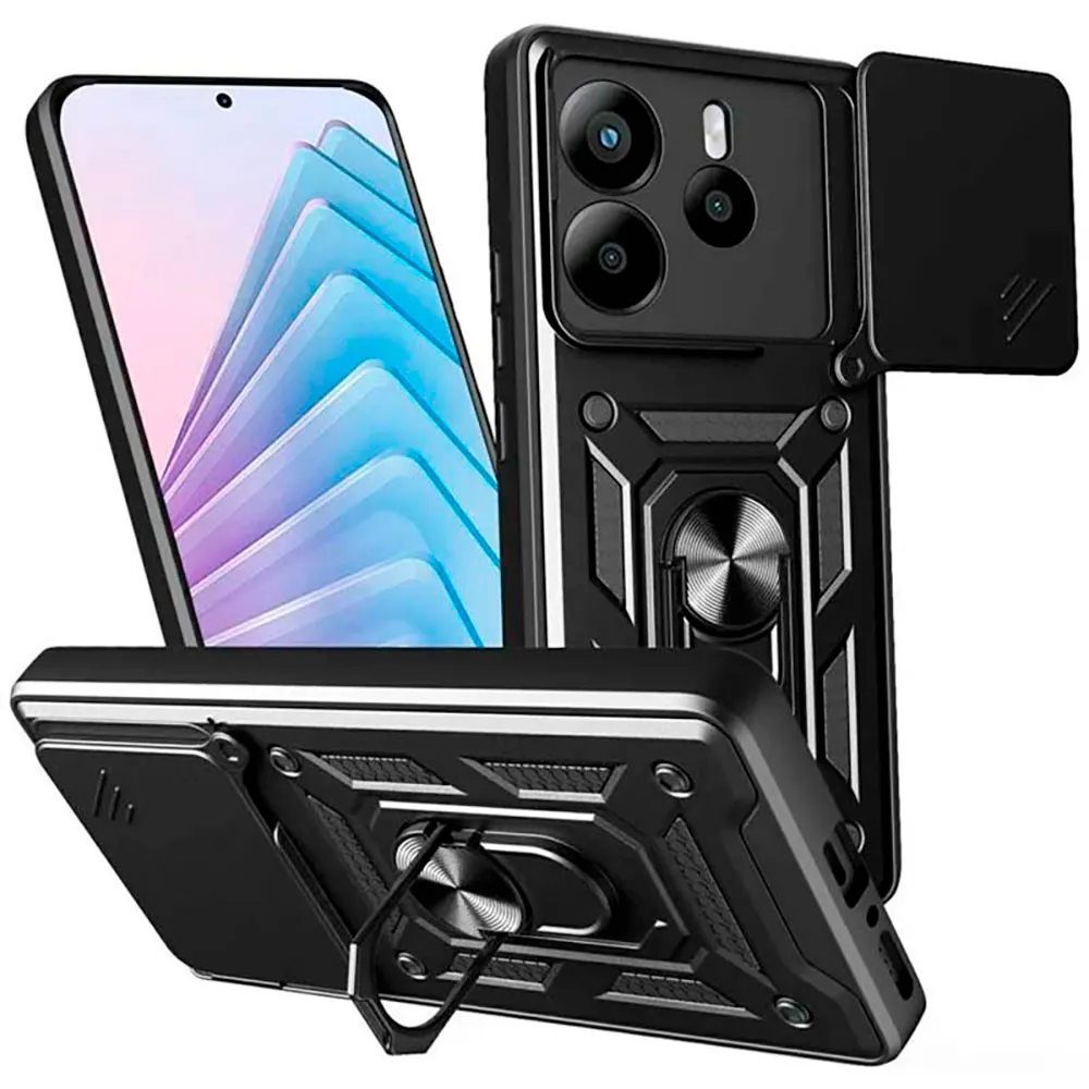 Svart Militär Skal för Xiaomi Redmi Note 14 5G med kameraskydd, magnetiskt stativ och ring.