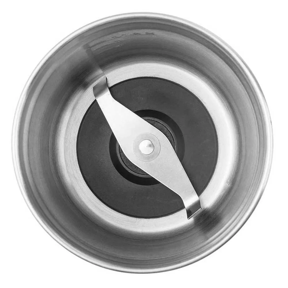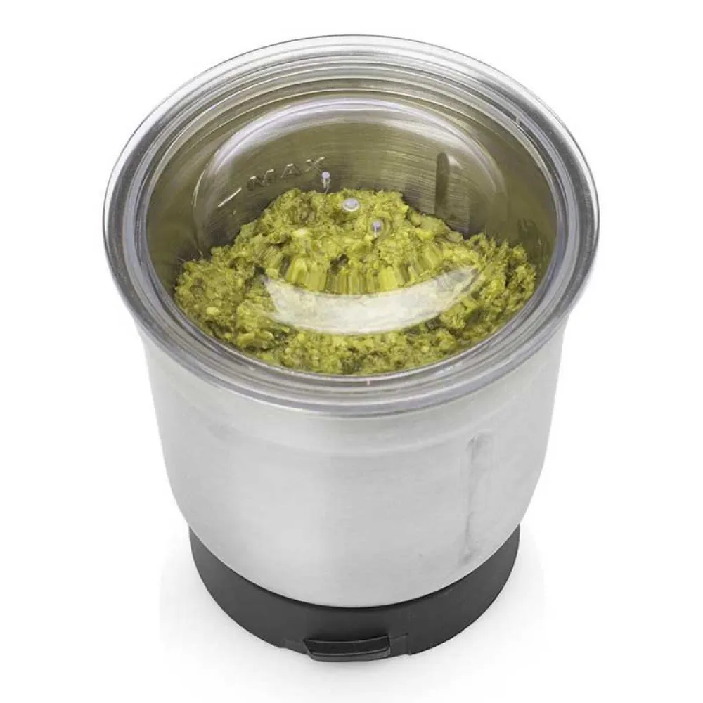 - Två löstagbara skålar i rostfritt stål för att hacka vitlök och färska örter och mala kaffebönor och kryddor.