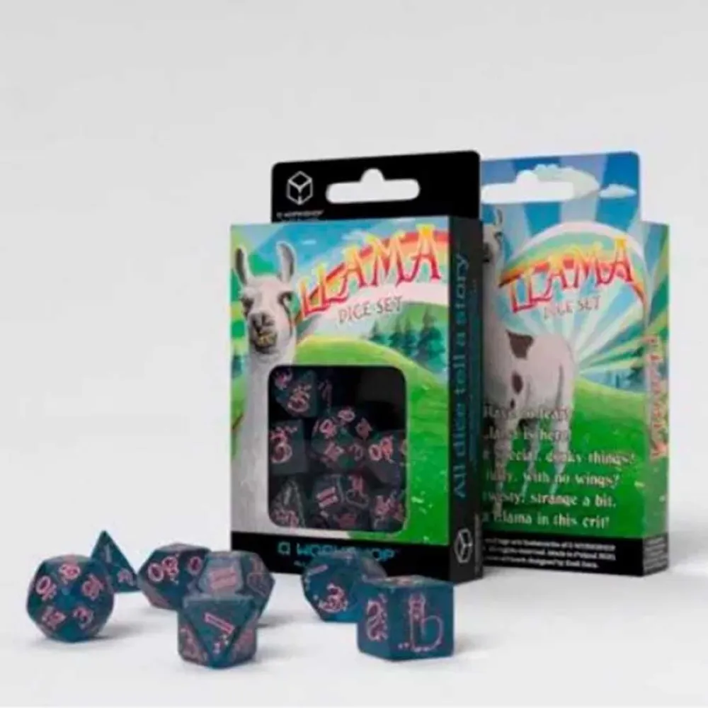De första 100 seten får nyckelbandet gratis också! Titta på dessa spektakulära varelser från Peru! Känn lamornas magi! Tärningsherdar från Q WORKSHOP rekommenderar detta set för alla, inte bara llama-fans! - 7 högkvalitativa handgjorda tärningar för rollspel.