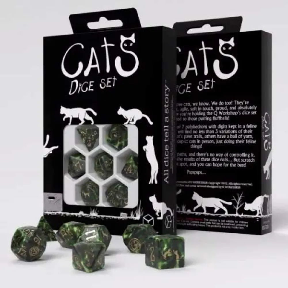 Det flaskgGröna materialet framhäver deras mystiska natur, medan de gyllene gravyrerna är som den ovärderliga belöningen för kattens uppmärksamhet! Detta set består av 7 polyhedrala tärningar: