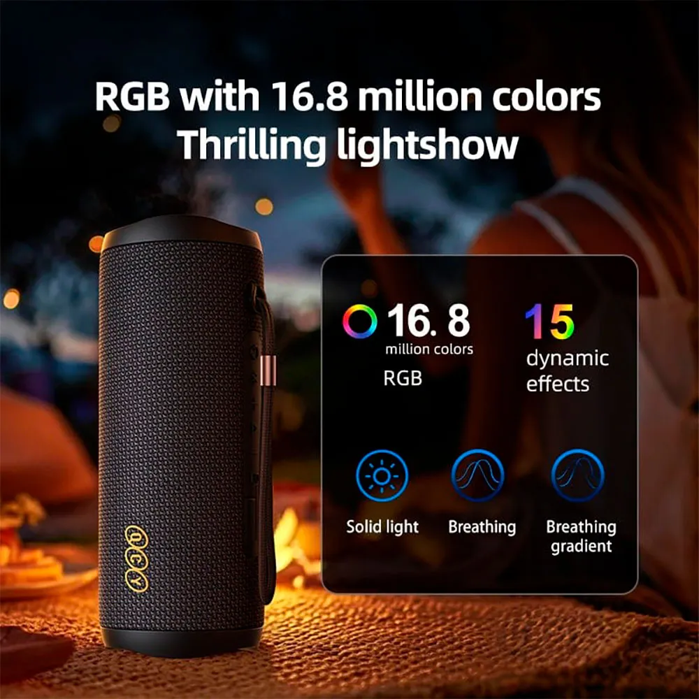 Förutom dess IPX7-vattentålighet utmärker sig högtalarens design för sin RGB-belysning, med 15 olika effekter som synkroniseras till musikens rytm via QCY-appen, idealisk för att liva upp dina fester.