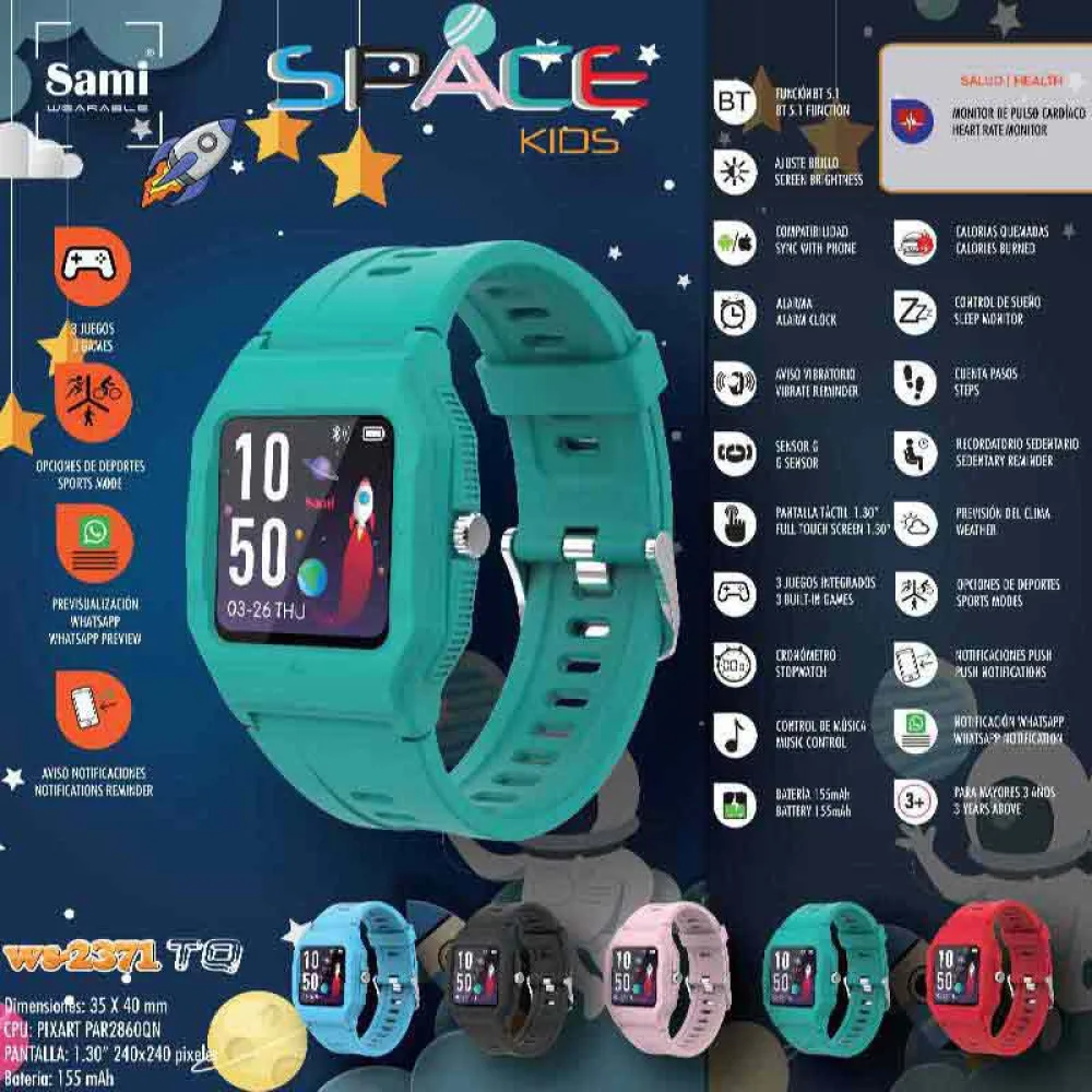 SAMI Space Kids Smartwatch är mer än bara en klocka; det är en omfattande kommunikations-, säkerhets- och aktivitetsmätningsenhet designad speciellt för barn. Med sitt intuitiva gränssnitt, hållbara design och en mängd funktioner är det den perfekta följeslagaren för barn i alla åldrar. Ge ditt barn gåvan av kontakt, säkerhet och roligt med SAMI Space Kids Smartwatch. Ge dem verktygen de behöver för att hålla sig säkra och uppkopplade samtidigt som du uppmuntrar en hälsosam och aktiv livsstil. Handledsbaserad pulsmätare och aktivitetsmätningsfunktioner ger värdefull data för föräldrar, vilket hjälper dem att förstå deras barns hälsa och välbefinnande. Välj SAMI Space Kids Smartwatch och upplev den sinnesro som kommer med vetskapen om att ditt barn är säkert, uppkopplat och engagerat.