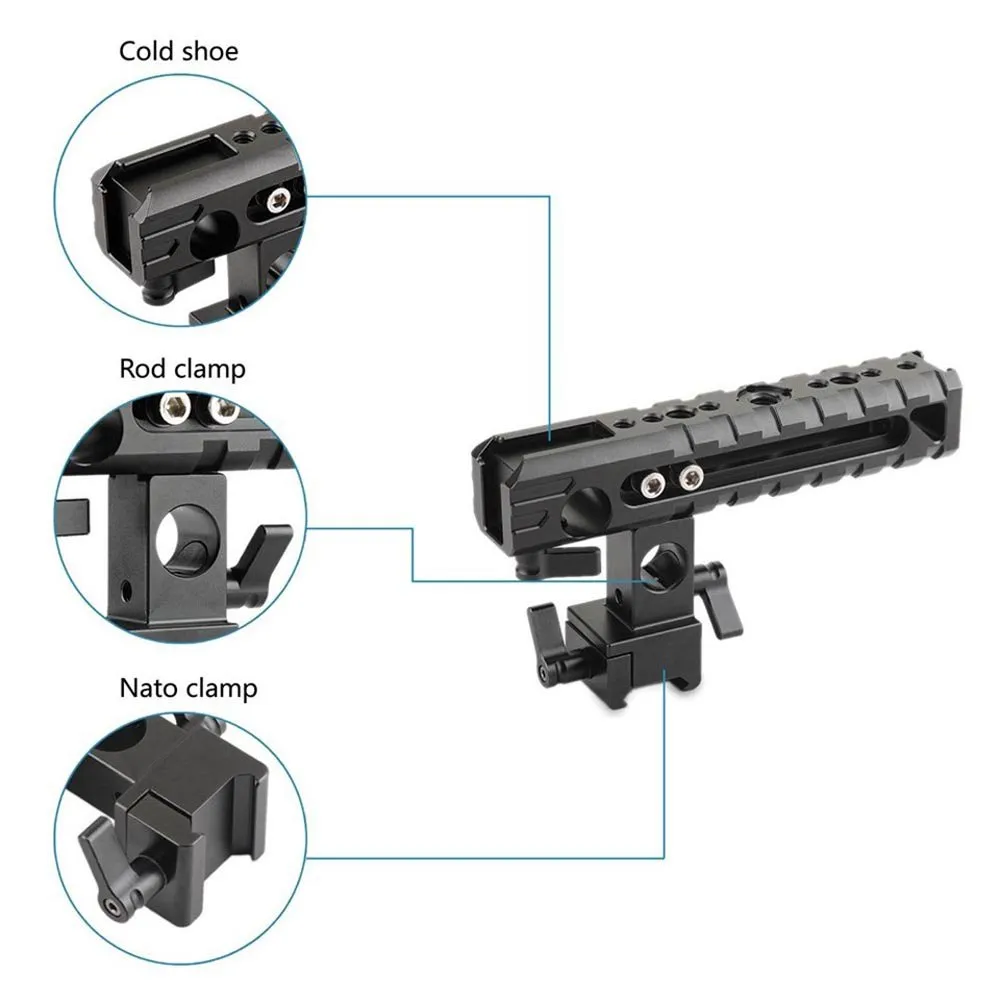 SmallRig QR Cheese Handle 1720 är ett övre handtag med snabbkoppling som fästs och lossas med en vingmutterskruv. Skjut den på säkerhetsskenan och dra åt vingmuttern, du kan låsa den på plats. E*förutom att skjuta den åt vänster och höger på Skena för att hålla din kamera balans, du kan också glida framåt och bakåt för att hitta balanspunkten för din rigg. Det här handtaget har flera funktioner. Sidans 15 mm öppning gör det möjligt att montera en 15 mm stång så att du kan fästa ditt följefokus, etc. 15 mm stångklämman gör det möjligt att fästa EVF-fäste eller mikrofonstötfäste etc. Ett integrerat skofäste på toppen för att fästa på kameraljus, mikrofonstötfästen med mera. Ytterligare ett integrerat skofäste i änden av handtaget för att fästa EVF fäste, etc. Handtaget levereras med hålmönstret för ARRI-tillbehörsmonteringsstift.1/4´´ 20 och 3/8´´ 16 hål på greppet för att fästa ytterligare tillbehör. Samtidigt ger den utsökt räfflade finishen med en mängd monteringspunkter dig ett bekvämt grepp. Handtaget är idealiskt för fotografering i lågläge och enkel transport av din kamera.