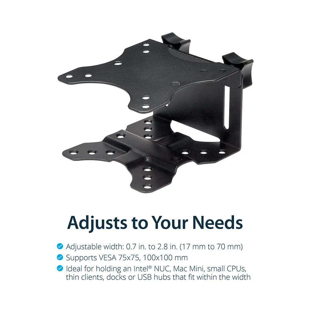 Detta justerbara fäste är idealiskt för att hålla en Intel® NUC, Mac Mini, de flesta små CPU: er, tunna klienter, dockningsstationer eller USB-nav som passar in i breddens justerbarhet för fästet (.7 till 2.8 / 17 mm till 70 mm). PC-monteringsfästet är också bra för montering av andra enheter bakom skärmar som trådlösa routrar, modem, videoförlängare och digitala skyltar mediaspelare.