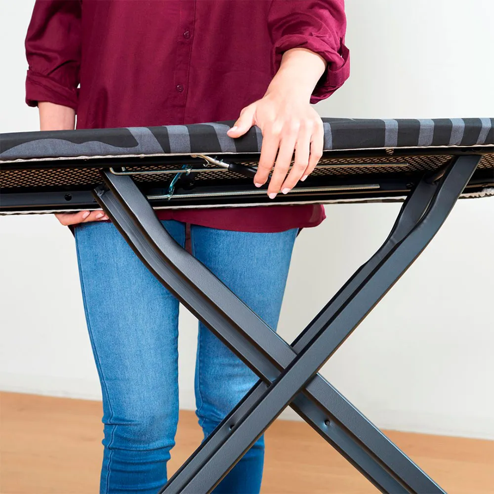 Denna robusta och stabila strykbräda har ett 0.8 mm tjockt stålstöd, lämpligt för ångstationer upp till 25 cm. Dess 100% bomullsöverdrag och stålnät säkerställer bättre värmefördelning. Med en justerbar höjd upp till 93 cm, en yta på 41x125 cm och en kompakt hopfällbar design, ger den komfort, hållbarhet och enkel förvaring.