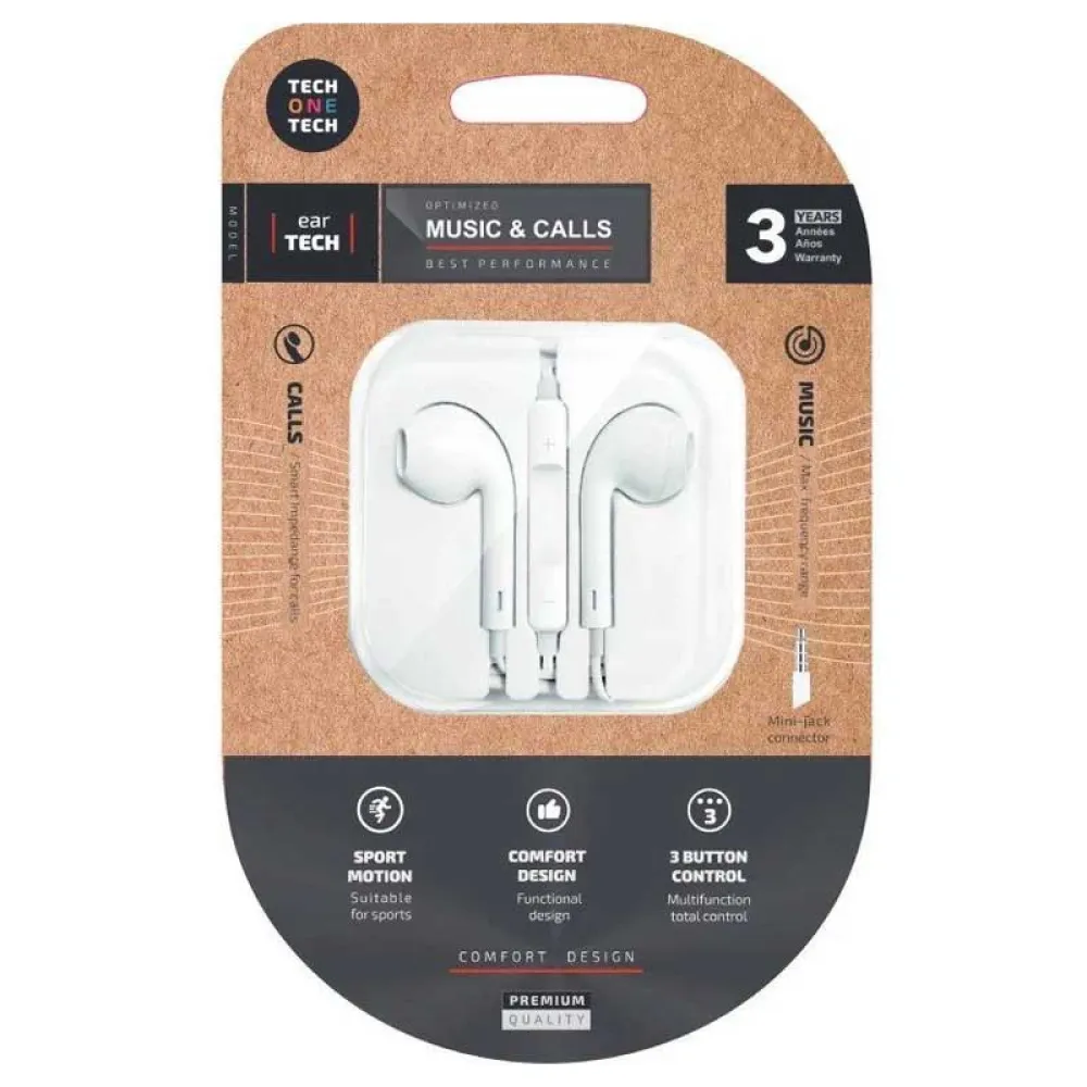 • EarTECH ergonomiska hörlurar, stereoljud, med mikrofon, volymkontroller och tredje multifunktionsknapp.