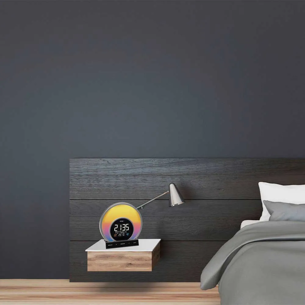 Individuellt. Soluna har andra ljusfunktioner som du kan använda i vardagen: Låt dig guidas genom en 10 minuters andningsövning i andningsläge. I kombination med valbara ljuseffekter (energi, värme, vila) kan du snabbt och enkelt koppla av. Skapa en behaglig atmosfär i vardagsrummet eller sovrummet med stämningsljuset. Välj din favoritfärg direkt från 14 olika tillgängliga nyanser eller välj det automatiska färgbytesprogrammet med mjuka övergångar. Den ljusa färgen kan också ändras beroende på komfortnivån i rummets klimat. På detta sätt kan du omedelbart se om du har det perfekta rumsklimatet i sovrummet. Det gröna ljuset indikerar att förhållandena är idealiska: Temperaturen är mellan 15 och 18 grader Celsius och luftfuktigheten mellan 50 och 70 procent. Ljuset är dimbart i fem nivåer och det är även lämpligt som nattlampa. Färgskärmen informerar dig om tid och datum; Veckans dag visas i sin helhet (på fyra språk). Dessutom visas den aktuella rumstemperaturen och luftfuktigheten på installationsplatsen. Skärmen kan justeras i fyra ljusstyrkenivåer, en automatisk dimningsfunktion aktiverad eller avstängd helt, så att du inte störs i sömnen på natten.Soluna har också en speciell funktion: en inbyggd laddningsfunktion för enheter med usb-anslutning, så att du kan ladda din smartphone över natten.
