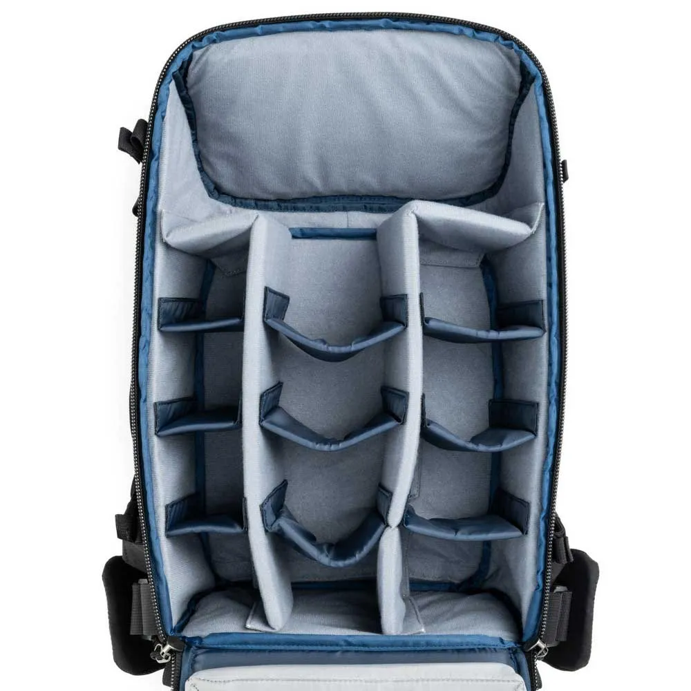 Inuti är det rymliga och fullt anpassningsbara huvudfacket redo att rymma en komplett professionell utrustning. De vadderade, justerbara avdelarna kan konfigureras för att säkert hålla en standard eller greppad DSLR- eller spegellös kamerahus med ett objektiv monterat, plus flera extra objektiv, en blixt eller till och med ett kompakt drönarkit. Interiören är designad för effektivitet, med dedikerade genomskinliga nätfickor för att organisera mindre tillbehör som batterier, minneskort och filter, så att du kan hitta det du behöver på ett ögonblick.