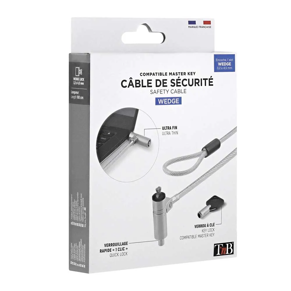 Ultraresistent, flätad stålkabel med PVC-beläggning och zinklås. Längd = 1.80m. Gör att du enkelt kan fästa enheten vid skrivbordet. Tunna och justerbara svängbara huvuden för att fästa den bekvämt, oavsett datorns position. Enkel låsning med 1 klick tack vare dess tryckknapp. Levereras med två personliga nycklar, exklusive huvudnyckel.