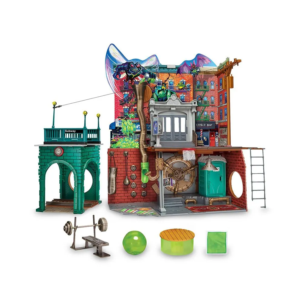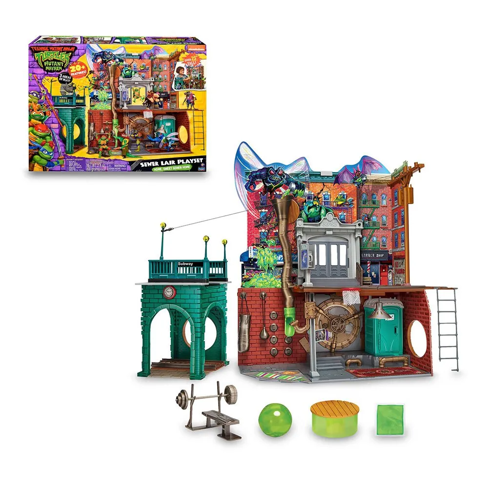 Även om sköldpaddorna bor i avloppen, gör de det med stil! Deras gömställe (den hemliga avloppsgömman) har allt, med mer än 20 actionfyllda funktioner, såsom en dojo där sköldpaddorna tränar för att slåss, en zipline för att ta sig från horisonten till gatan på några sekunder, en hiss som tar dem från avloppen till gatan, en hemlig pansardörr, glidbanor och falska golv, en slemmig slempack och mycket mer! Det mest sålda leksetet genom tiderna är tillbaka, helt förnyat! Detta lekset har de viktigaste inställningarna i Ninja Turtles-filmen 2023: