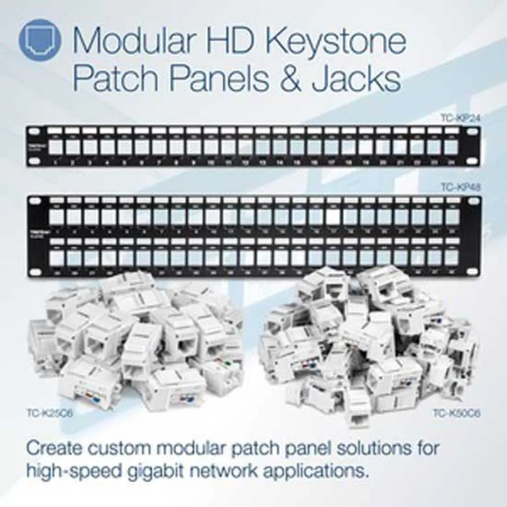 TRENDnets 48-portars tomma Keystone 2U patchpanel, modell TC-KP48, är designad för användning med TRENDnets Cat6 keystone-jack (TC-K25C6 och TC-K50C6).