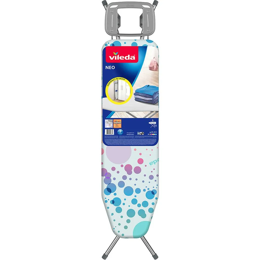 Liten neo strykbräda 114x33cm 163309 vileda. Vileda neo är en liten bekväm strykbräda, perfekt för dig som inte har mycket utrymme hemma. Den är lätt och hanterbar, vilket gör att den lätt kan transporteras och förvaras. Dess höjdjusteringssystem (71 och 90 cm) gör att den kan anpassas till olika behov. Metallnätet och det andningsbara bomulls- och skumskyddet tillåter god ångtranspiration.