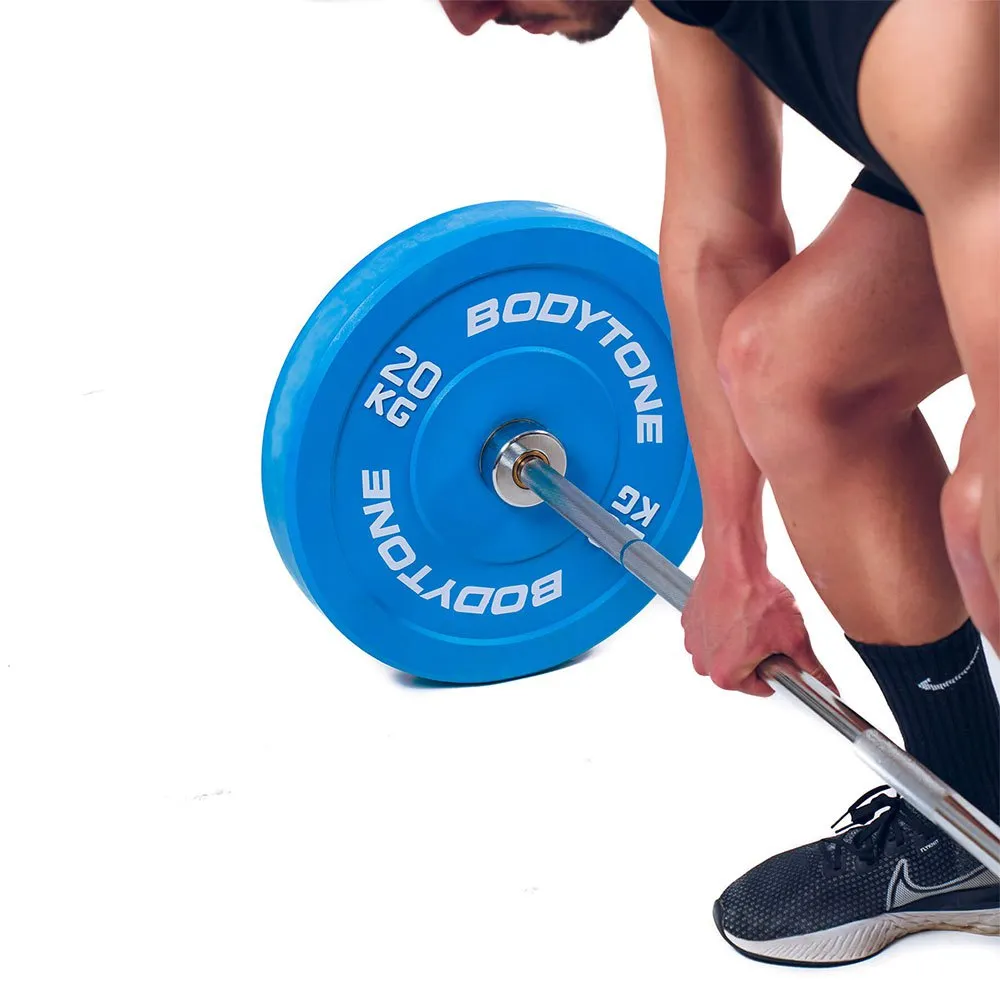BODYTONE Rubber Bumper Plate 20kg Blue er et must-have bodybuilding udstyr til vægtløftere og fitnessentusiaster. Disse vægtskiver er lavet af materialer af høj kvalitet, der er robuste, holdbare og langtidsholdbare. De er designet til at passe til alle standardstænger og kan modstå den hårdeste træning uden at bøje, revne eller deformere. Den lyse blå farve på pladerne tilføjer et strejf af stil til dine vægtløftningssessioner og gør dem let genkendelige.