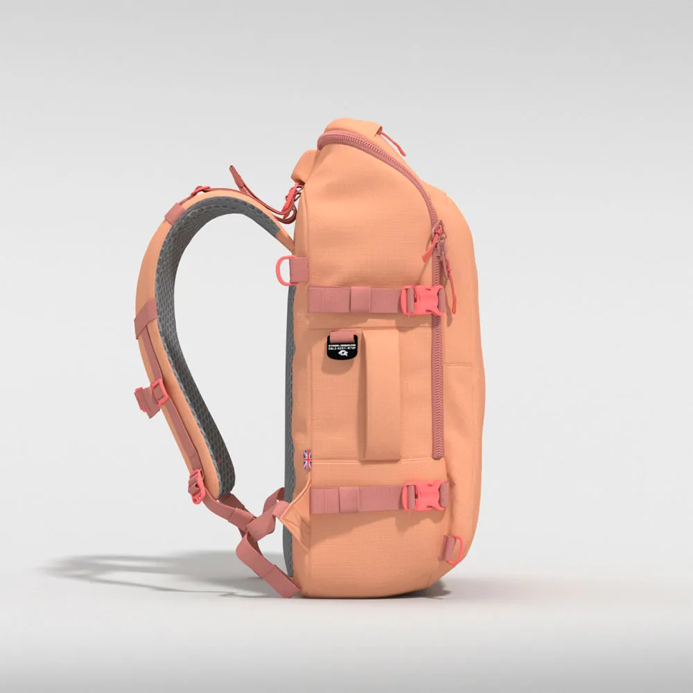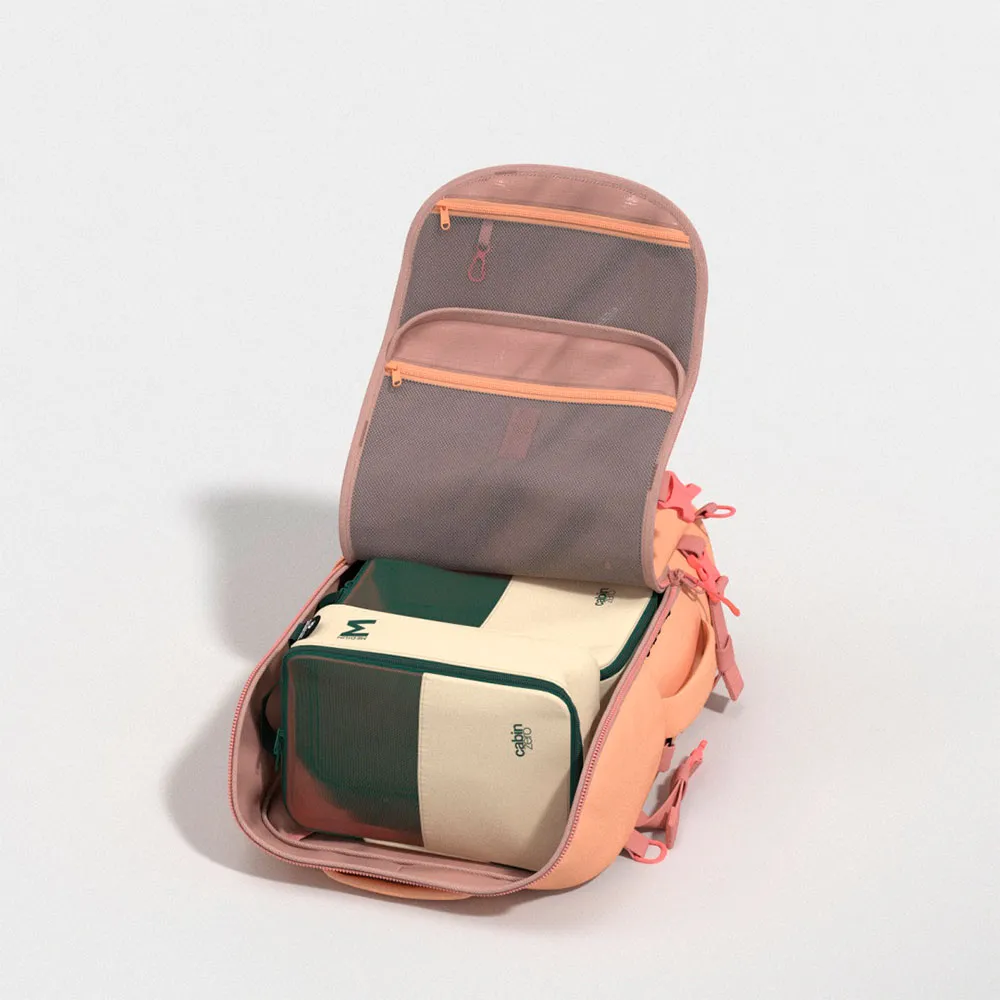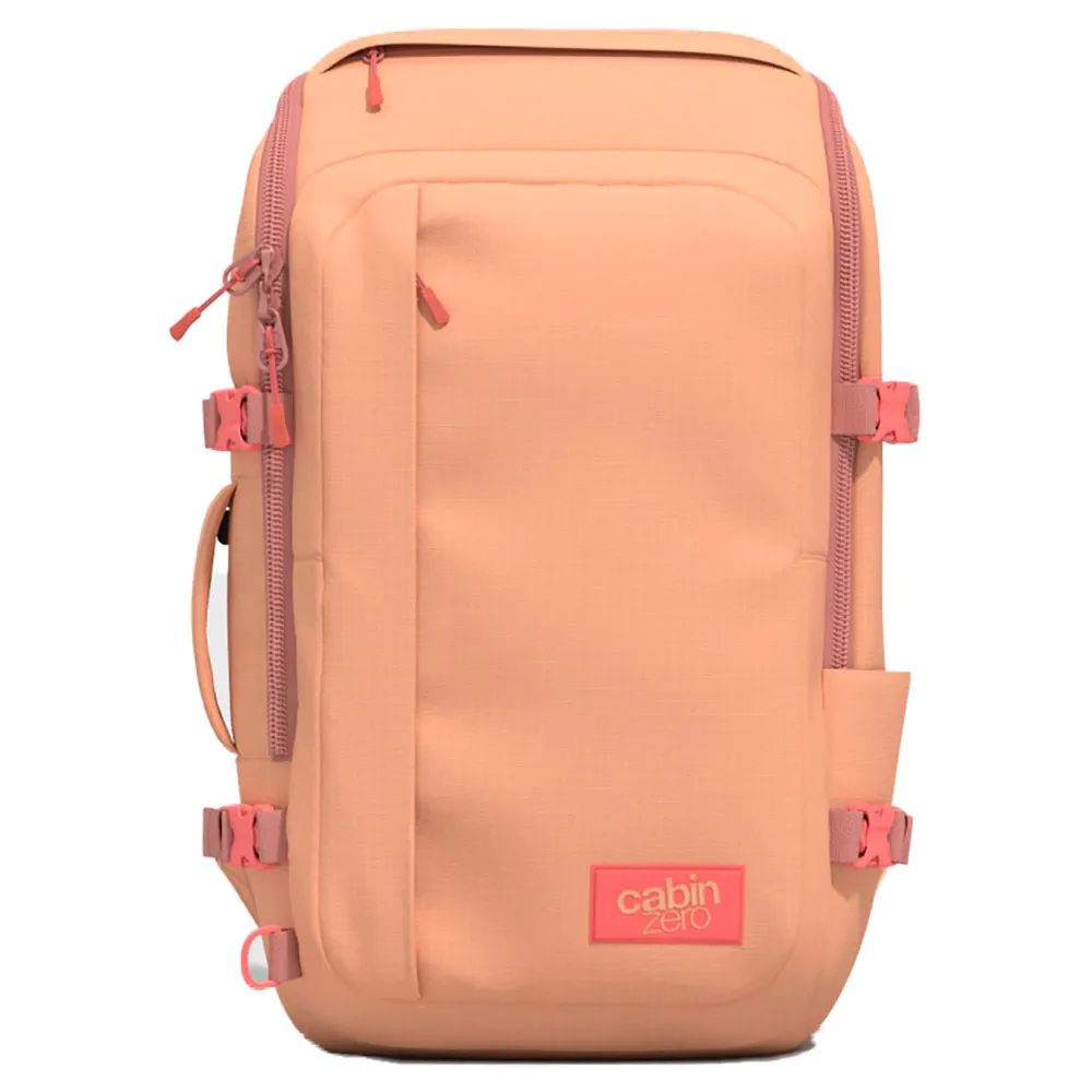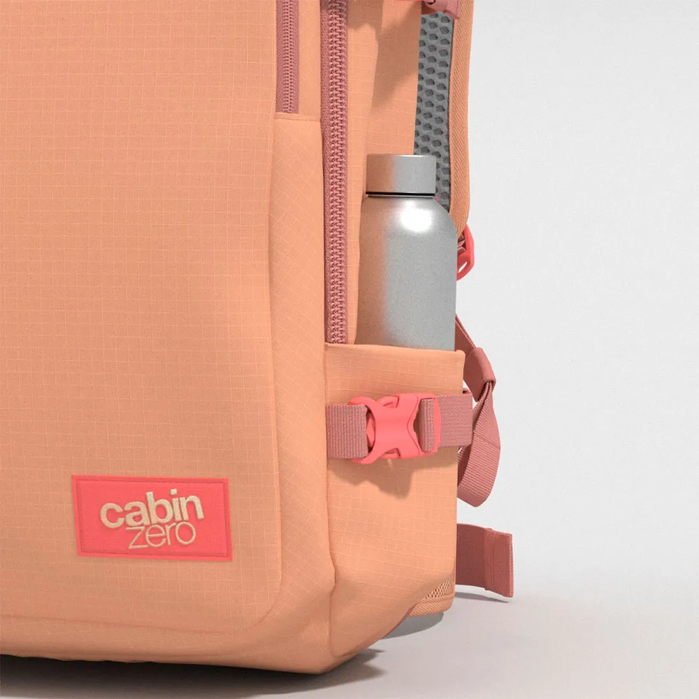 Den kombinerer alle de karakteristiske CabinZero taske-funktioner, inklusive en lynlåslomme med hurtig adgang, et hovedrum der kan fyldes fra toppen eller fronten, en vandflaskeholder og et gemme-væk hoftebælte og skulderstropper.