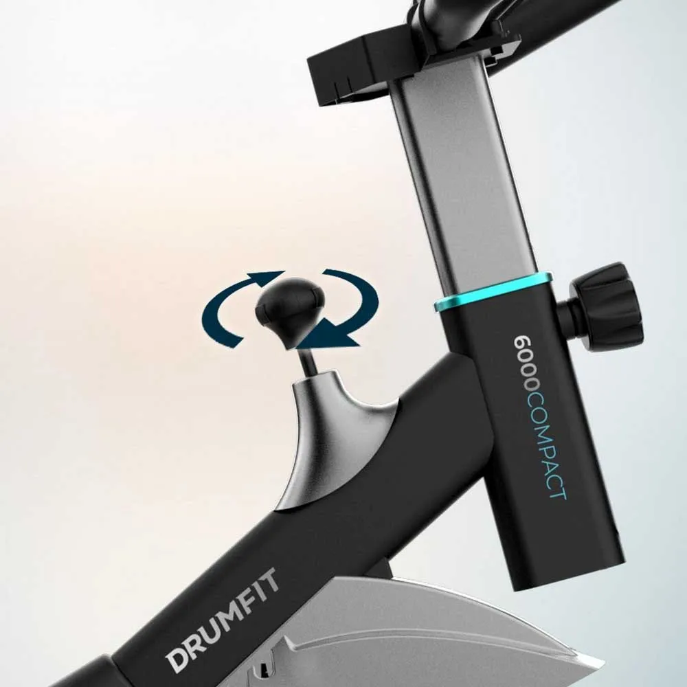 DrumFit Indoor 6000 Compact Kompakt indendørs motionscykel med et 6 kg svinghjul. LCD-skærm. Enhedsholder. Transporthjul. Justerbar modstand. Justerbart sadel og styr. Maksimal vægt på 120 kg og maksimal højde på 175 cm.