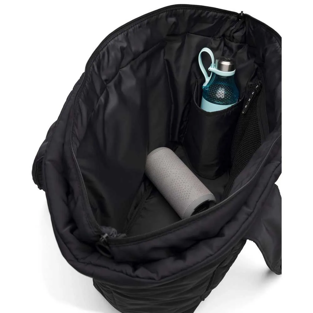 - Interior mesh zip pocket with hair tie zipper puller & interior water bottle pocket