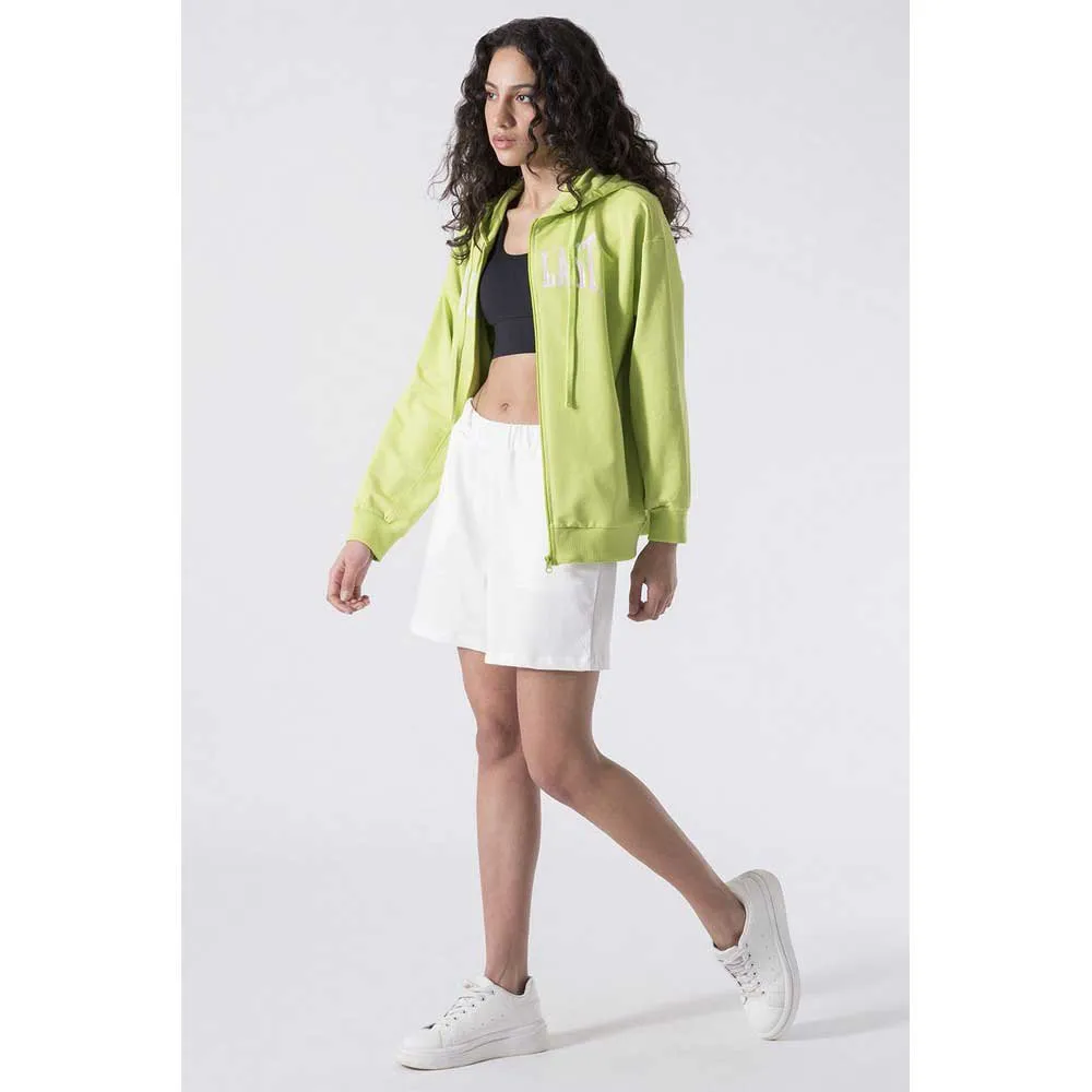 Kapuzenjacke mit durchgehendem Reißverschluss aus ungekämmtem Stretch-Fleece. Die Oversize-Passform macht sie praktisch und bequem, ideal zum Tragen sowohl bei körperlicher Aktivität als auch im Fitnessstudio. Das Everlast-Logo ist auf der Vorderseite mit irisierendem Effekt aufgedruckt, was einen glamourösen und stilvollen Touch verleiht.
