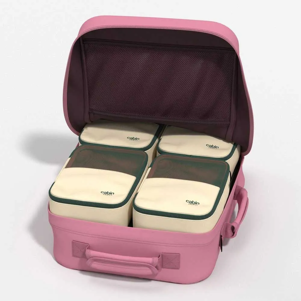 Be amazed at how much you can pack without ever feeling weighed down. The CabinZero Classic cabin bag in Macaron Pink holds everything you need (and then some). Weighs under 800g, and stays under 1.5kg even with two full packing cube sets.