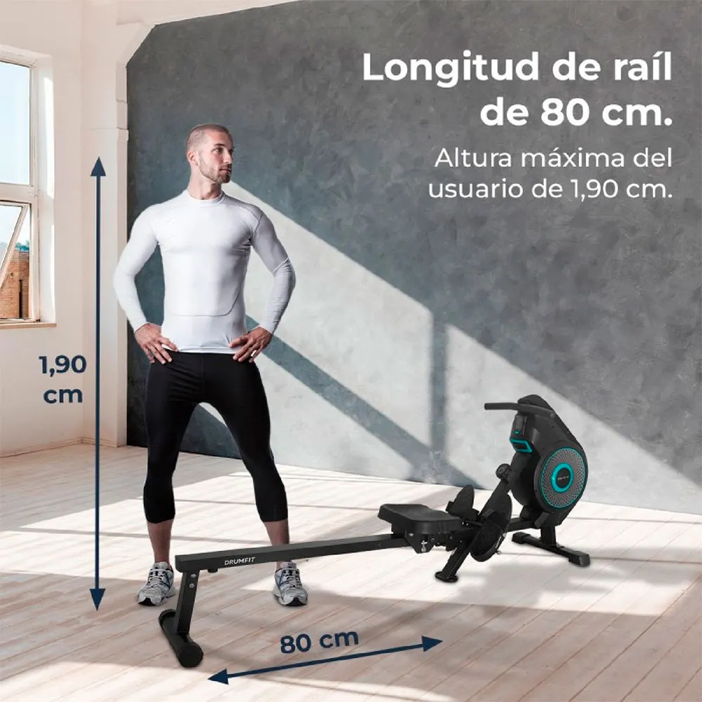 Drumfit Rower Eolo Magno Combined Resistance Rowing Machine: Air and Magnetic. LCD screen. 8 manually adjustable resistance levels. Transport wheels. Fastening straps. Maximum user height 190 cm. Folds vertically.