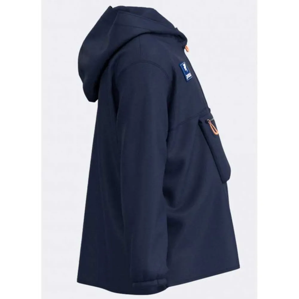 Waterproof jacket for children. This coat is designed to protect the little ones from the cold and rain, ensuring they stay dry and comfortable in any weather condition. It features a hood and a half-zip closure with chin and puller protection. The cuffs have elastic for a better fit and to retain heat. Additionally, it is equipped with a large front pocket with zipper and puller, ideal for securely storing personal items in an accessible way. Made primarily with polyester and a waterproof fabric that resists up to 5,000 mm of light rain and/or dry snow, ensuring excellent protection against moisture. The material is resistant and durable, ensuring the jacket withstands daily use and outdoor activities, while keeping the children warm and comfortable. Joma logo on rubber tag.