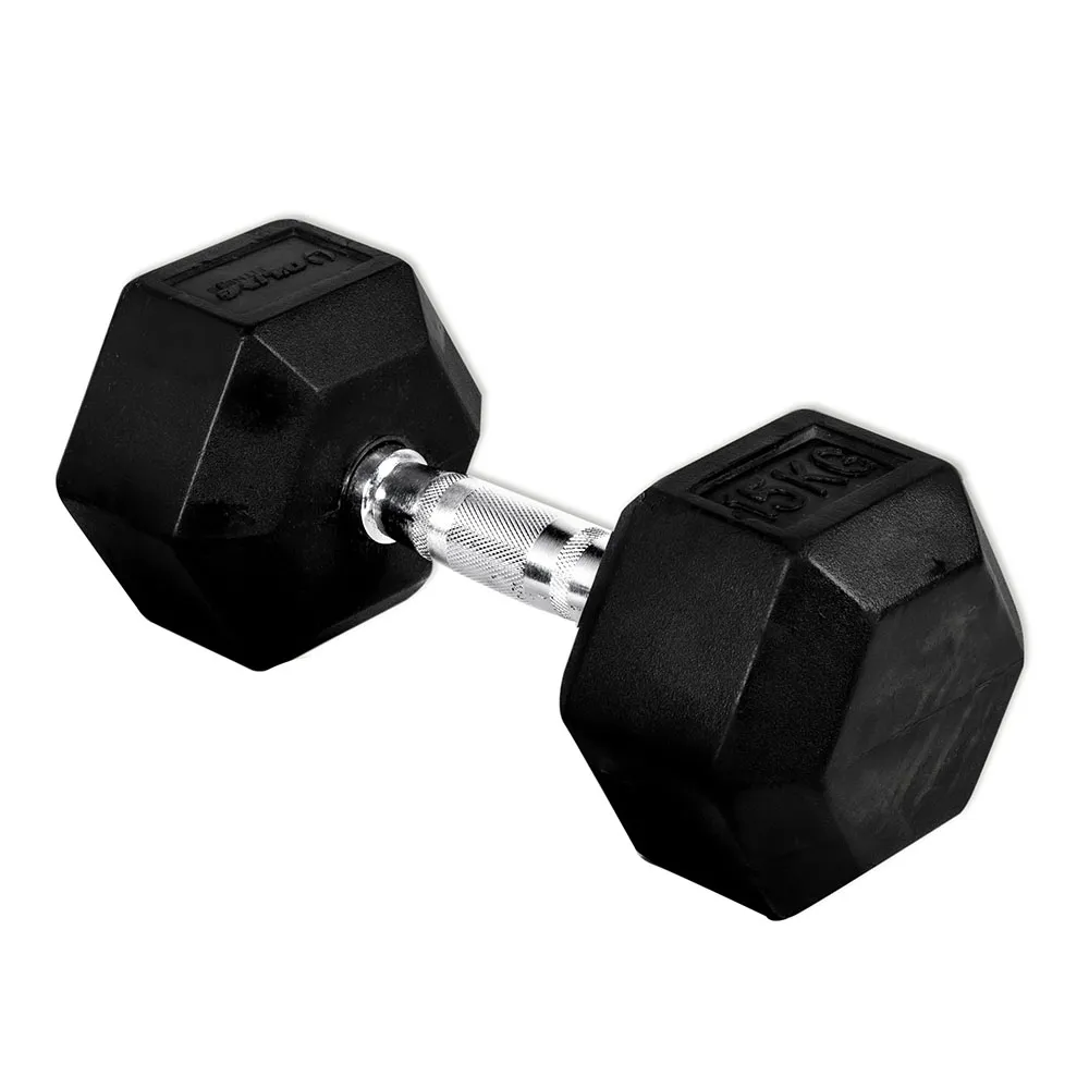 Dumbbells hexagonal shape with slightly contoured grip, rubber coating, high durability. Allows for floor exercises as well as lifting.