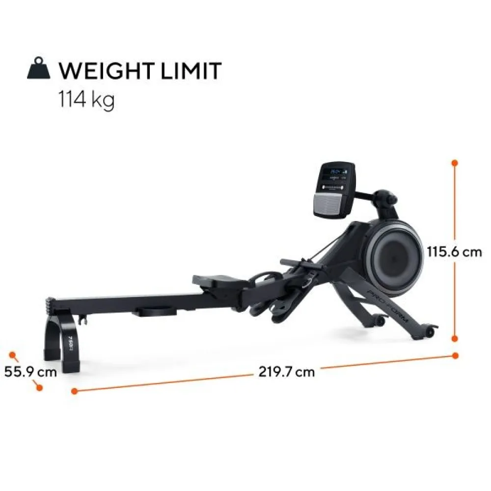 ProForm 750R; Rower with 5” Display, Built-In Tablet Holder and Space Saver Design. Row around the world with expert trainers on ProForm’s 550R Rower. With an iFIT subscription, your rower can deliver workouts that are personalized to you, no matter where you are in your fitness journey. Just connect your own smartphone or tablet with Bluetooth® to enjoy thousands of expert-led, outdoor workouts from iFIT. As you follow iFIT Trainers, SmartAdjust™ will automatically change your 24 digital resistance levels based on your workout history and performance. Sit comfortably on the ergonomic molded seat and maintain an easy grip with the soft touch ergonomic handles. If you only want to do manual workouts without iFIT, the built-in 5” high contrast display will show live stats, including strokes, strokes per minute, total strokes, time, and estimated calories. When you’re finished with your workout, easily fold the rower in half and use the transport wheels to roll it to a corner to maximize your space. Whether you´re looking to elevate your fitness level, burn some calories, or simply enjoy a more immersive and effective workout experience, the 750R Rower has you covered.