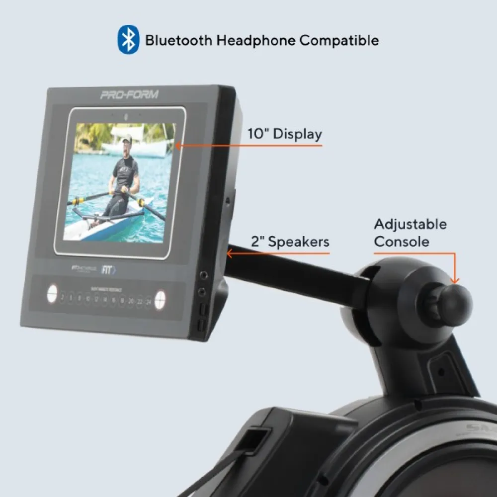 ProForm Pro R10 Rower with 10” Touchscreen and Space Saver Design. Row around the world with expert trainers on ProForm’s Pro R10 Rower. With an iFIT subscription, your rower can deliver workouts that are personalized to you, no matter where you are in your fitness journey. Enjoy thousands of expert-led, outdoor workouts from iFIT. As you follow iFIT Trainers, SmartAdjust™ will automatically change your 24 digital resistance levels based on your workout history and performance. Sit comfortably on the ergonomic molded seat and maintain an easy grip with the soft touch ergonomic handles. The 10” touchscreen will show live stats, including strokes, strokes per minute, total strokes, time, and estimated calories as you row in the most beautiful locations around the world. The Adjustable Silent Magnetic Resistance makes every change in resistance fluid, quiet, smooth, and natural. When you’re finished with your workout, use the transport wheels to easily roll it to a corner to maximize your space. Plus, the solid frame is built to support users up to 250 lbs. Whether you´re looking to elevate your fitness level, shed some pounds, or simply enjoy a more immersive and effective workout experience, the Pro R10 Rower has you covered. *iFIT experience shown. Internet and Wi-Fi required. iFIT Membership auto-renews for /mo plus tax unless canceled in advance. Cancel at any time.