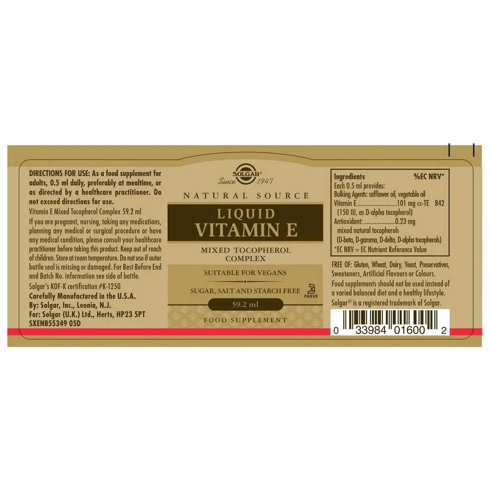 - Protects Cells From Oxidative Stress - Supports The Immune System - Natural Vitamin E (D-Alpha Tocopherol) - Easy To Take Liquid Form - Includes Mixed Tocopherol Complex Ingredients:- Solgar® Natural Source Liquid Vitamin E - 59.2 Ml, Comes In Liquid Form To Support The Absorption Of This Fat-Soluble Nutrient And Contains The Recommended Daily Intake Of Vitamin E In Just 5 Drops A Day.