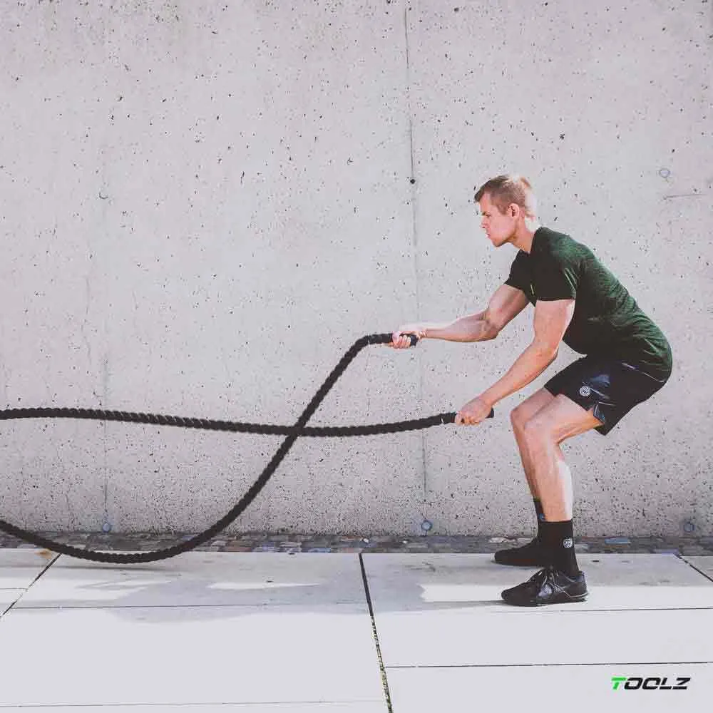 Hard training brings success: With the TOOLZ Battle Rope, core stability as well as shoulder and arm strength are effectively improved The fitness rope is suitable for indoor and outdoor training and is simply tied around a tree or an anchor point and the training can begin. The intensity is determined by the speed and rhythm of the arm movements. The rope has a diameter of 35 mm and fits perfectly in any hand, and the coated rope ends ensure for a comfortable and non-slip grip. TOOLZ offers over 70 training products in the categories of strength training, coordination, fun play, stretching and yoga. More variety and dynamism in your training. With the clever fitness equipment.