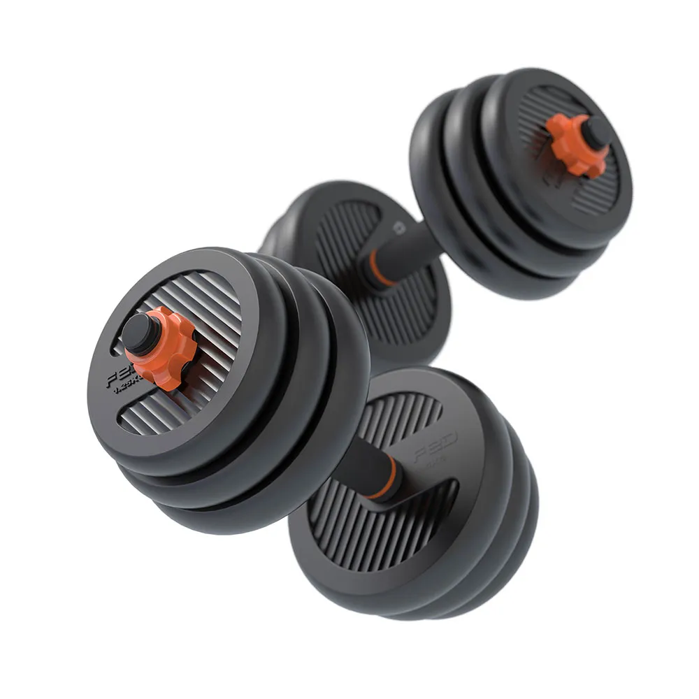 Kit básico de entrenamiento compuesto por mancuernas y discos de diversos pesos.