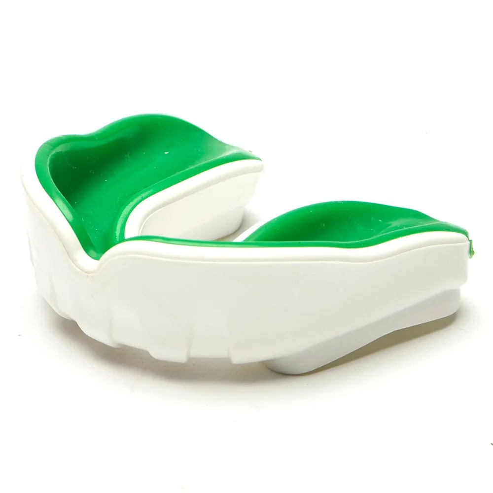 Protector bucal de un solo arco suficiente para deportes de combate. El material utilizado es fácilmente moldeable en agua caliente, así puedes obtener un ajuste que se adapta perfectamente a la forma de tus dientes. Con un bonito diseño (hubiera preferido que no fuera blanco) y una protección eficaz y adecuada.