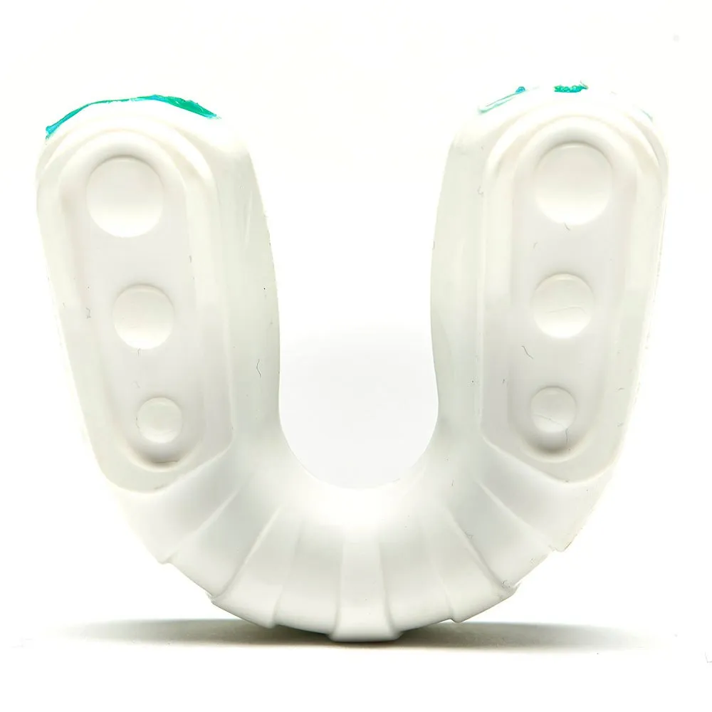 Este material toma el molde exacto de los dientes asegurando un cierre seguro y cómodo. Proporciona protección completa a la mandíbula, los dientes y el cráneo. Además, los canales facilitan la respiración adecuada. Tecnología de hervir y morder a través de moldeado por calor.