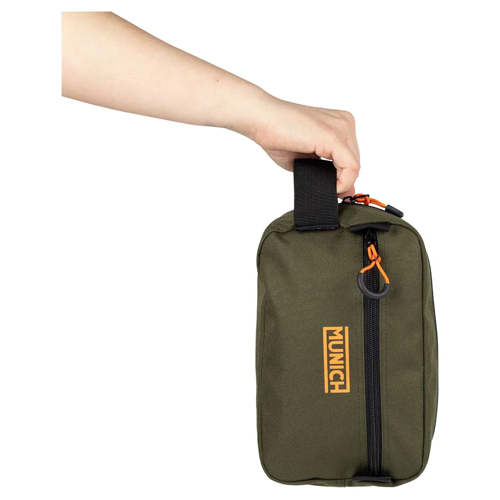 La funcionalidad es el corazón de su diseño. El bolso cuenta con un cierre de cremallera superior seguro que se desliza suavemente, proporcionando un amplio acceso al compartimento principal. Un bolsillo frontal adicional de fácil acceso es perfecto para guardar artículos más pequeños que necesitas tomar rápidamente, como tiritas, estuches para lentes de contacto o documentos de viaje. Para la máxima comodidad, un asa lateral resistente permite un transporte sin esfuerzo, una fácil recuperación de una maleta llena o la capacidad de colgarlo en un gancho en un baño, ahorrando valioso espacio en el mostrador. El frente está adornado con una distintiva aplicación gráfica que presenta el icónico logotipo de Munich, un sello de calidad y diseño contemporáneo.