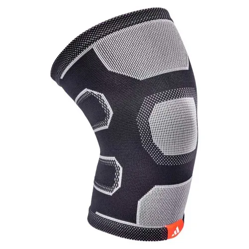 Nylonin ja spandexin seoksesta valmistettu hengittävä ja joustava materiaali tarjoaa tuen, joka mukautuu jalkaan keskitetyn renkaan avulla, joka yhdistää tiukemmin neulottun osan ja korkeamman joustopaneelin, jolloin tuki muodostuu täysin polvilumpion kohdalle. Paksuilla hihnoilla varustettu polvisuoja pysyy paikallaan voimakkaissa harjoituksissa, mutta se on helppo pukea ja riisua.