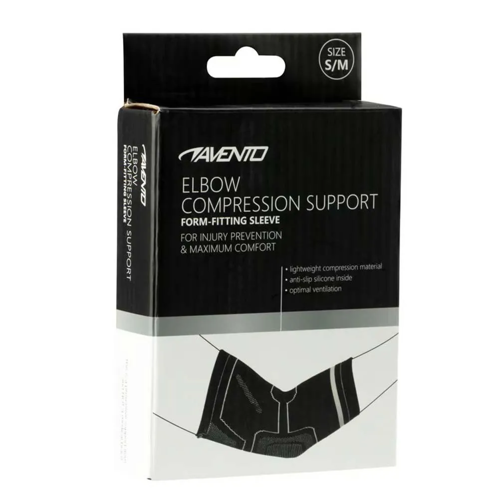 AVENTO-kompressiotuen kyynärsidos mustalla/hopeasävyisellä harmaalla on suunniteltu tarjoamaan erinomainen tuki, suoja ja helpotus kyynärliitokselle. Kyynärsidos on erityisesti kehitetty auttamaan aktiivisesti urheilevien ja nivelkipuja tai epämukavuutta kokeneiden ihmisten palautumisessa ja hoidossa.