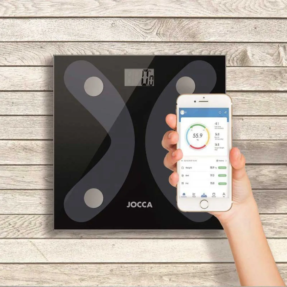 Jocca Bluetooth 4.0 -vaaka on valmistettu karkaistusta lasista, jossa on kaksi suurta kosketuspistettä kehon rasvaprosentin, kehon veden, lihasmassan, luun, BMI:n, kalorien, viskeraalisen rasvan ja painon määrittämiseksi mahdollisimman tarkasti. Voit hallita kaikkia näitä arvoja mobiilisovelluksella.