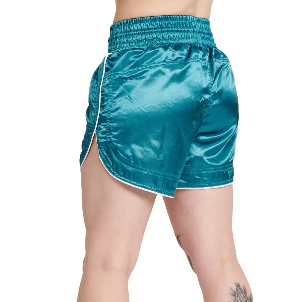 Naisten kick/thai-nyrkkeilyshortsit kiiltävästä satiinista, kirjailtu logo, kontrastiset reunat ja klassinen etiketti vyötärönauhassa. Siinä on erityisen naisellinen muotoilu, joka mukautuu täydellisesti vartalon siluettiin ja naistaistelijoiden tarpeisiin. Olennainen ja moderni ilme tekee niistä erityisen käytännöllisen ja monipuolisen mallin. Erinomainen vastine rahalle, helposti muokattavissa.
