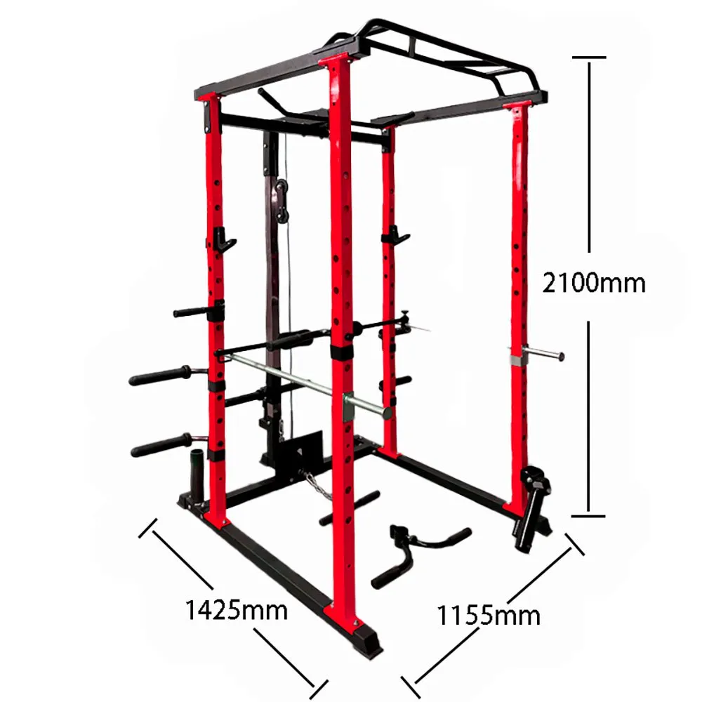 Tämä teline on varustettu lattahihnapyörällä, joka sisältää vetotangon ja suoran tangon, kaksinkertaisella vetotangolla pystyliittimillä, säädettävällä turvatangolla, T-tankolla maamiinan kahvalla, upotustangoilla, 2x J-koukuilla, painolevyn pidikkeillä ja joustotankolla.