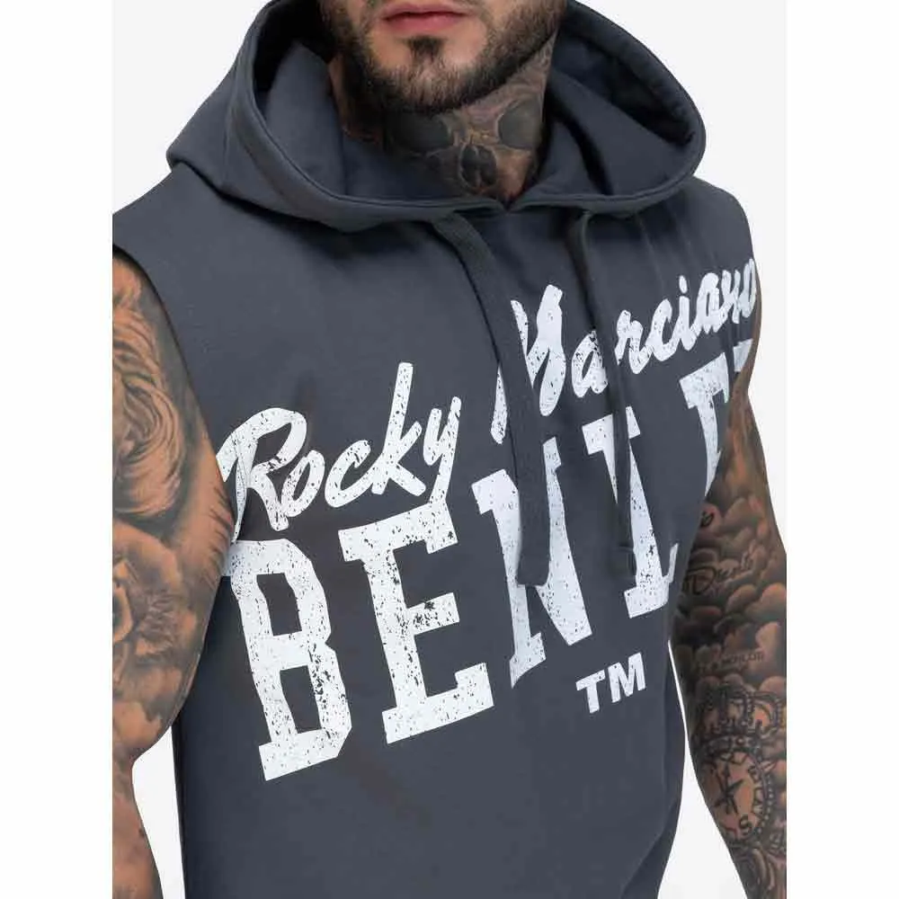 Sleeveless hoodie with hood and striking lettering on the chest. The hood can be individually adjusted with the drawstrings.