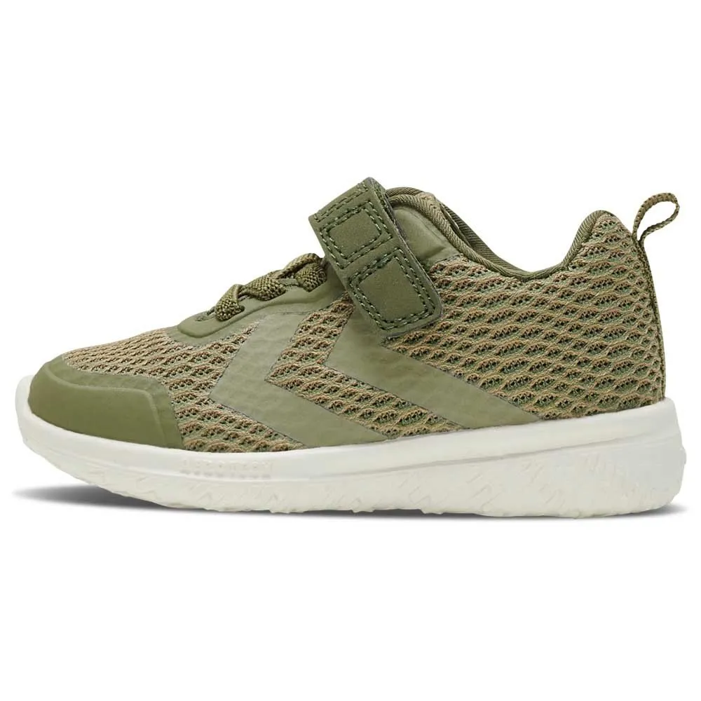 Les chevrons emblématiques hummel® reposent sur les côtés aux côtés de lacets élastiques avec une fermeture VELCRO découpable et une languette arrière au talon, permettant le plus simple des enfilages et des retraits.