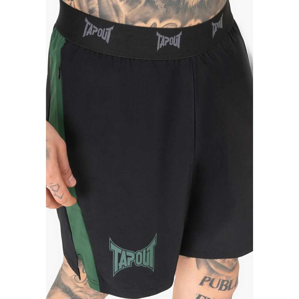 Short homme coupe droite. Short de sport avec élastique logo, empiècements contrastés sur les côtés et poches zippées dissimulées. Un logo Tapout sur la jambe droite complète le design.