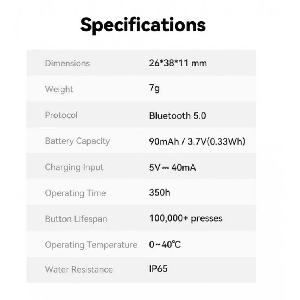 - Capacità della Batteria: 90mAh/3.7V(0.33Wh)