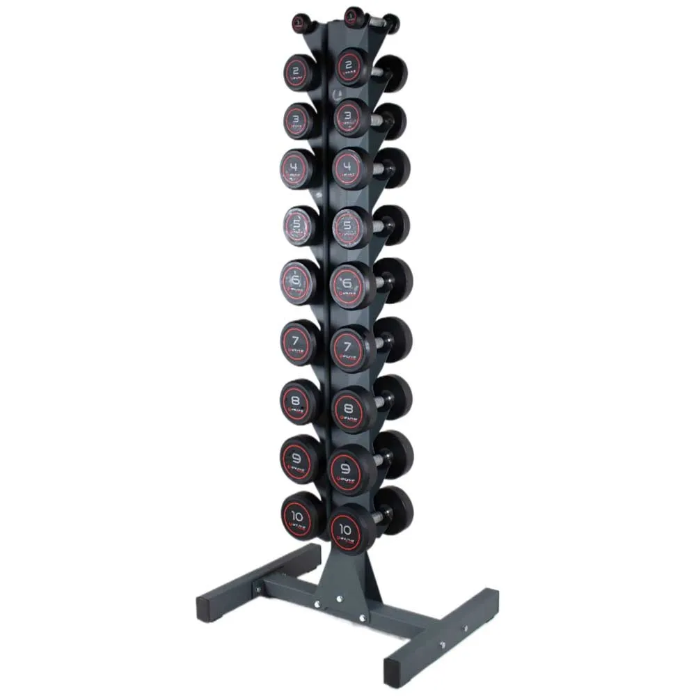 Dotato di supporti in gomma che proteggono sia i manubri che il rack stesso, questo rack assicura che la tua attrezzatura rimanga saldamente in posizione.